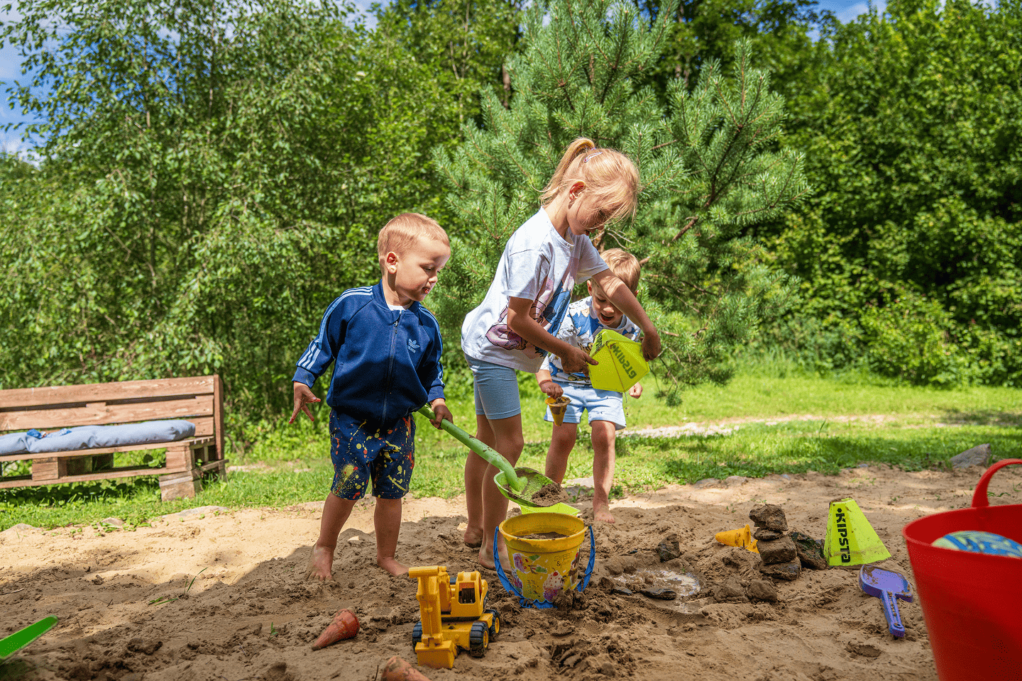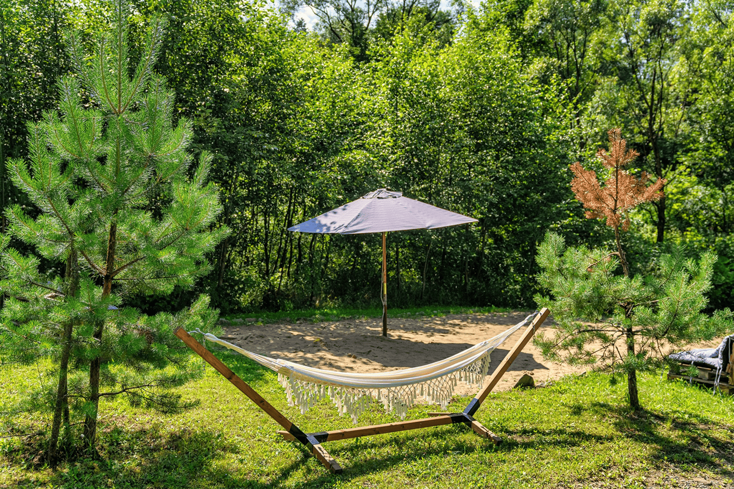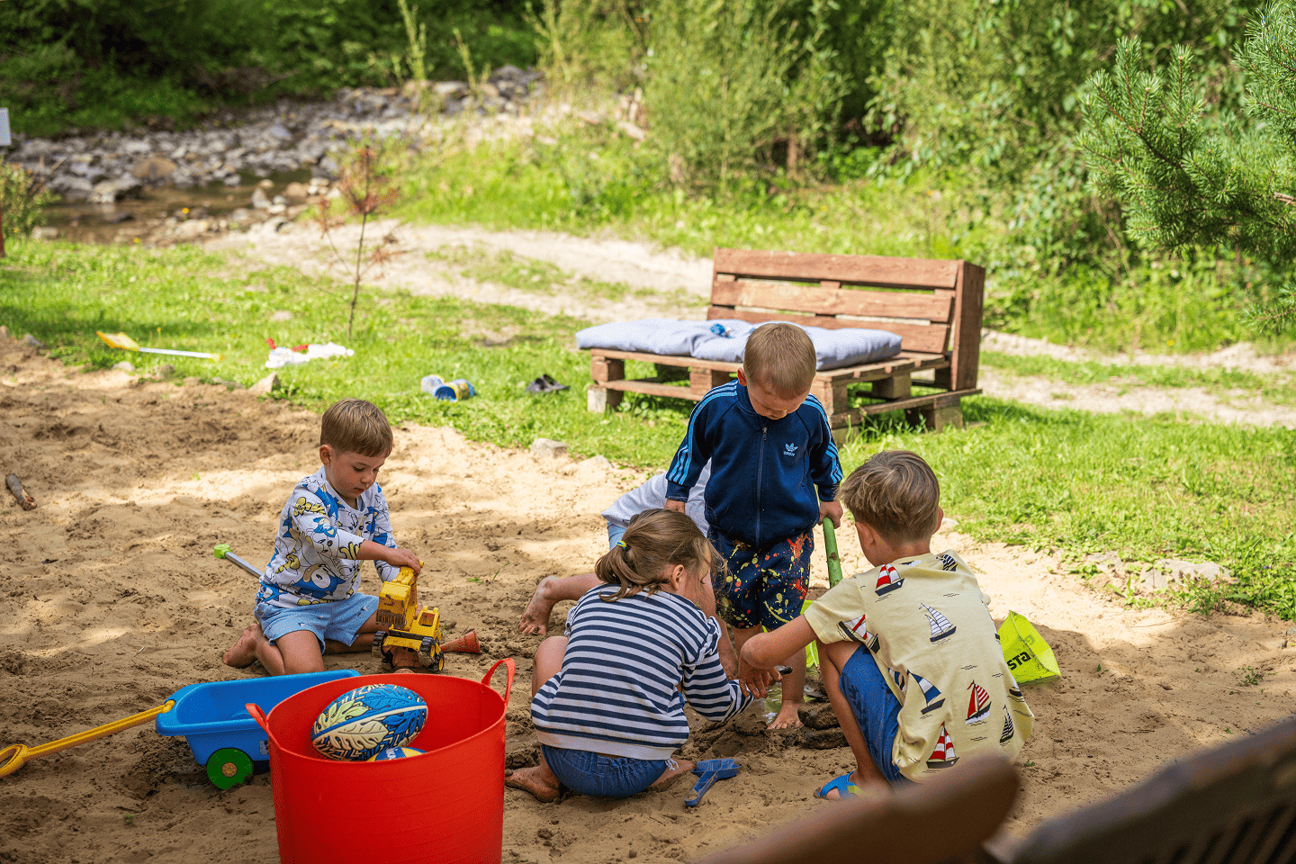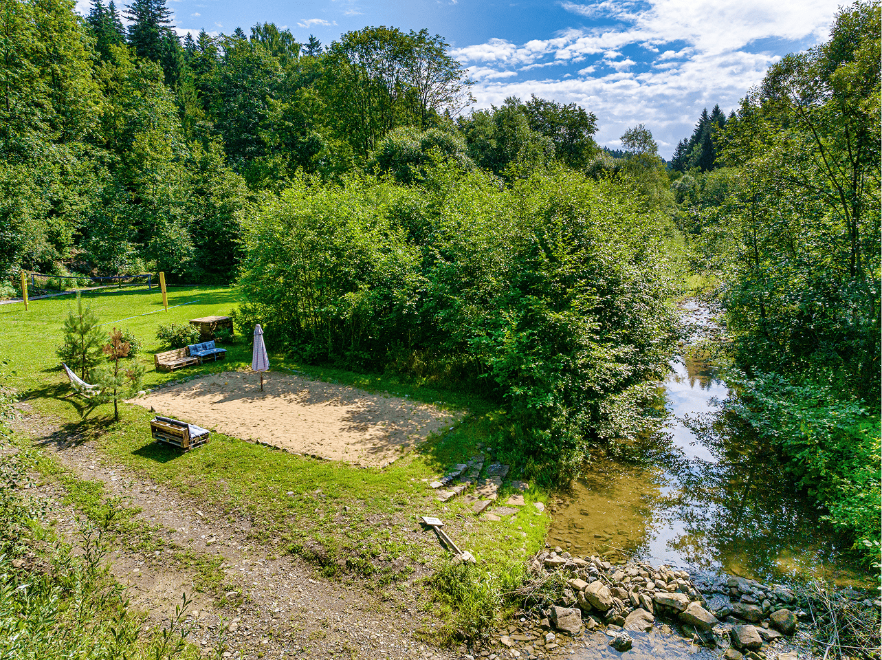 Tuż przy naszym obiekcie płynie malownicza rzeczka, idealna na letni wypoczynek i zabawę dla najmłodszych. Rzeka jest płytka, spokojna i bezpieczna, dzięki czemu dzieci mogą bez obaw brodzić w wodzie, budować tamy z kamieni i bawić się w naturalnym otoczeniu. Nad rzeczką usypaliśmy piaszczystą plażę dla jeszcze większego komfortu naszych Gości.